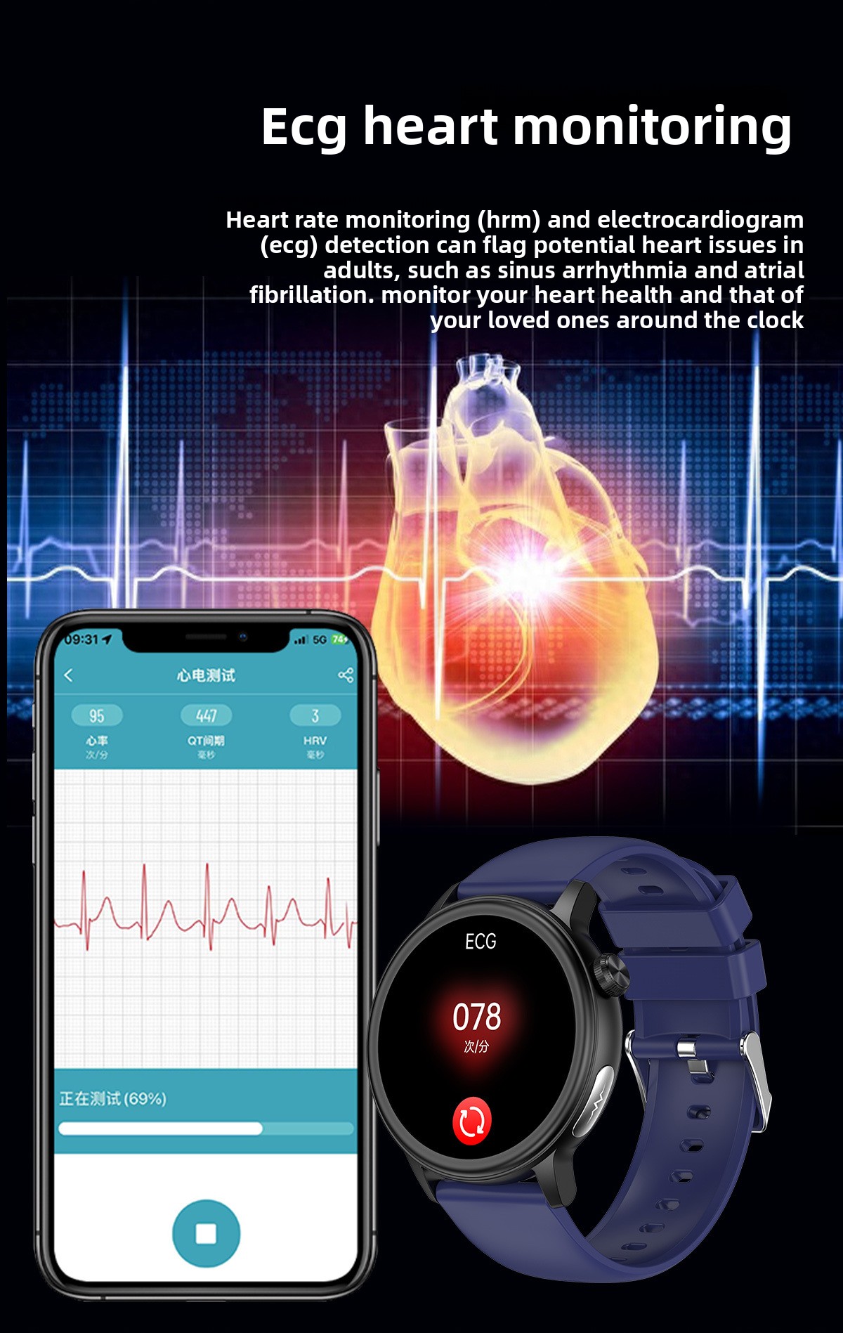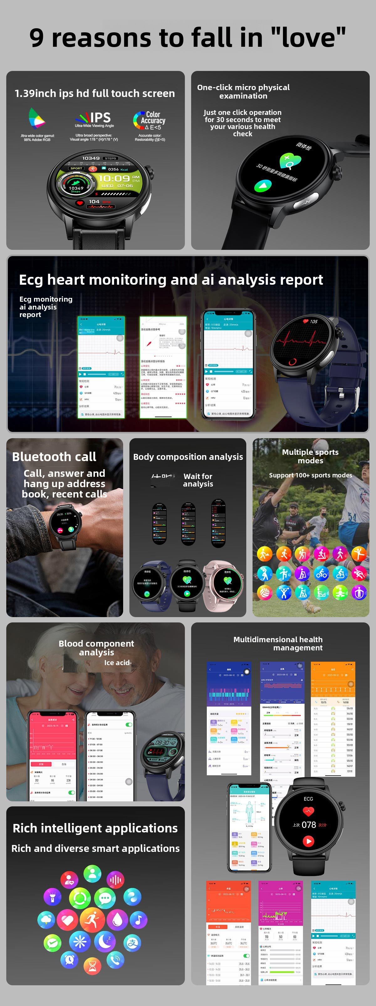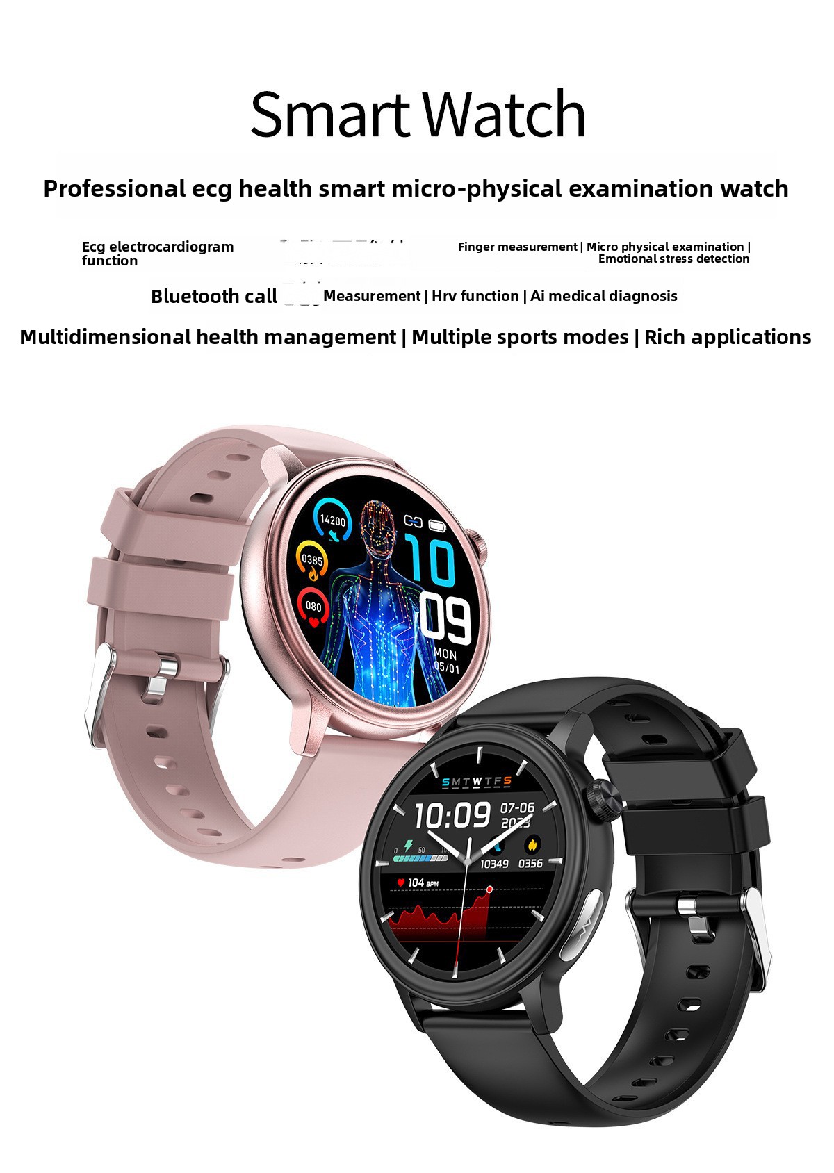 Health Monitoring: Tracks blood pressure, blood oxygen, ECG, heart rate, and body temperature